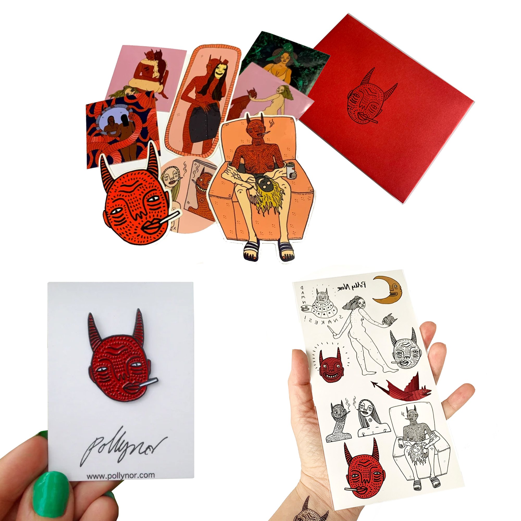 Combination bundle containing Polly Nor's Sticker pack, Temporary Tattoos and Lapel Pin. This combination saves on cost and shipping.