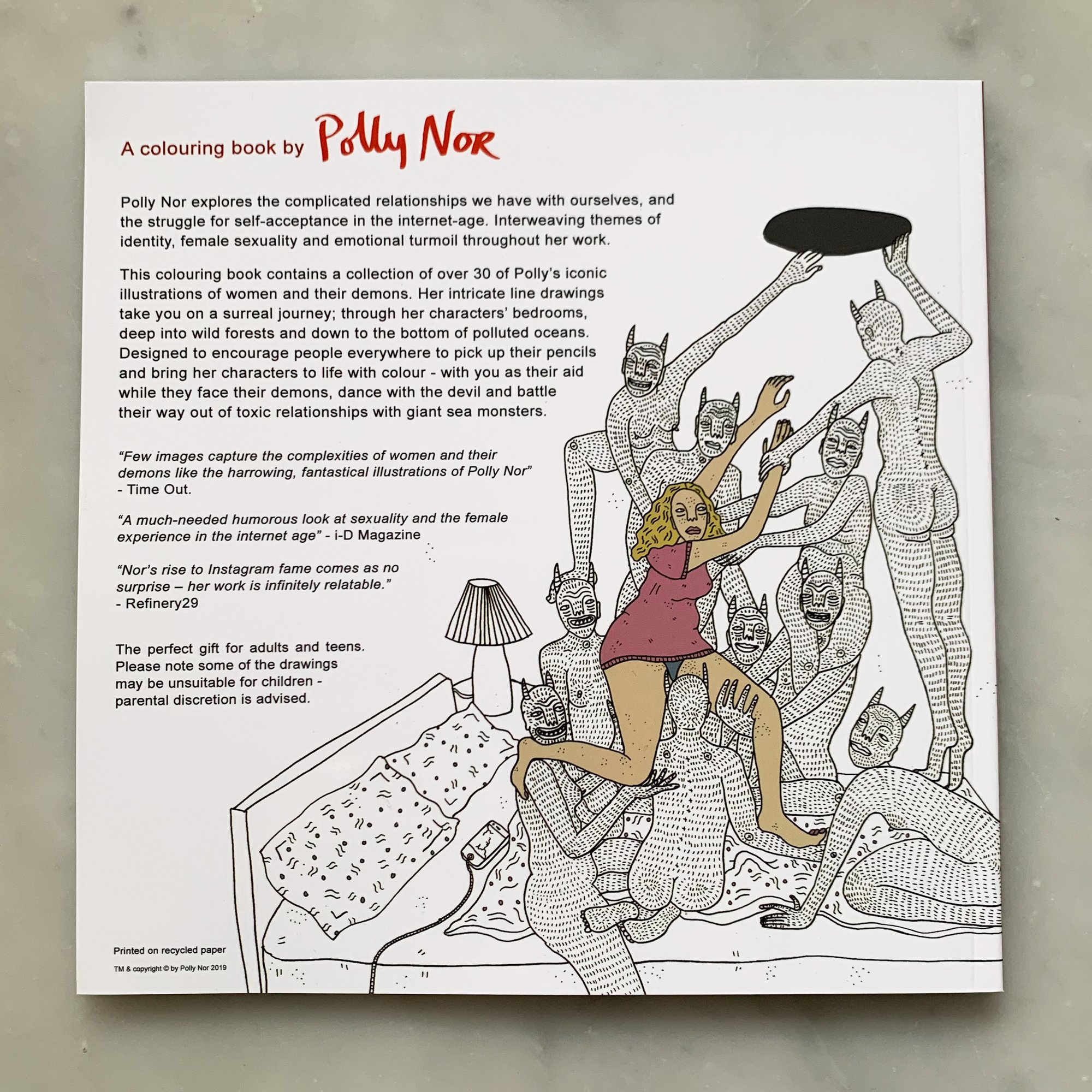 This colouring book contains a collection of over 30 of Polly’s iconic illustrations of women and their demons. Her intricate line drawings take you on a surreal journey; through her characters’ bedrooms, deep into wild forests and down to the bottom of polluted oceans. Designed to encourage people everywhere to pick up their pencils and bring her characters to life with colour - with you as their aid while they face their demons, dance with the devil and battle their way out of toxic relationships with giant sea monsters.