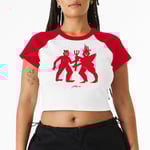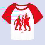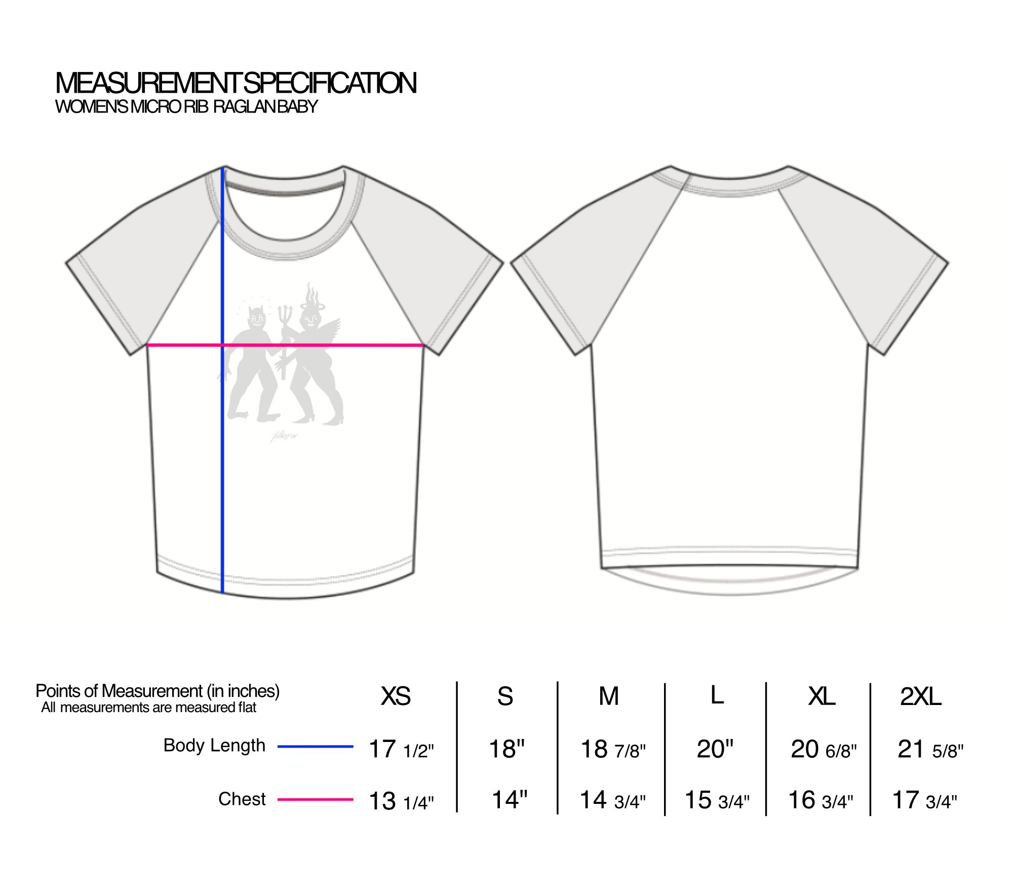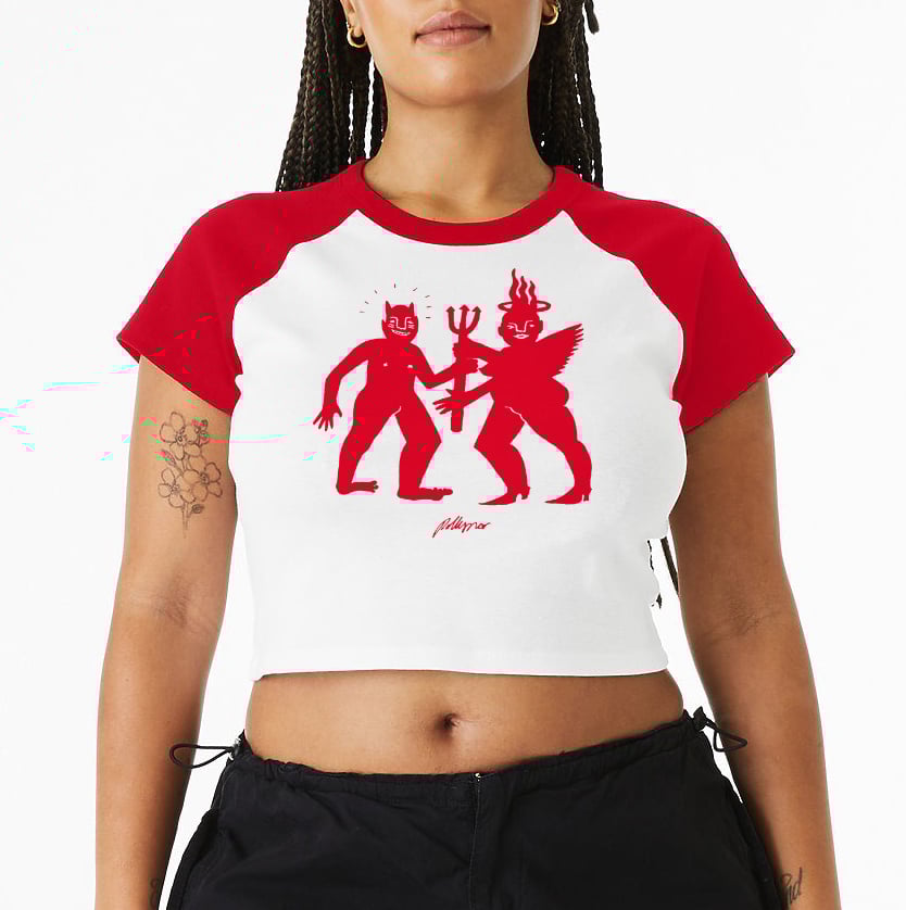 "Demon, Angel, Baby-Gurl T" by Polly Nor. Made for adults, but in a different fit to our usual oversized T's. These are screen printed on a Micro Rib Raglan Baby Tee in a shrunk, stretchy slightly cropped fit. Crewneck binding, cap sleeves with contrast colouring.